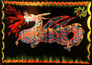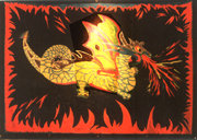 Fire Dragon 6 ft. x 4 ft. UV fabric paints and gold foil on theatrical canvas