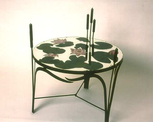 oils on reverse of mirror, wrought iron base made from recycled materials
